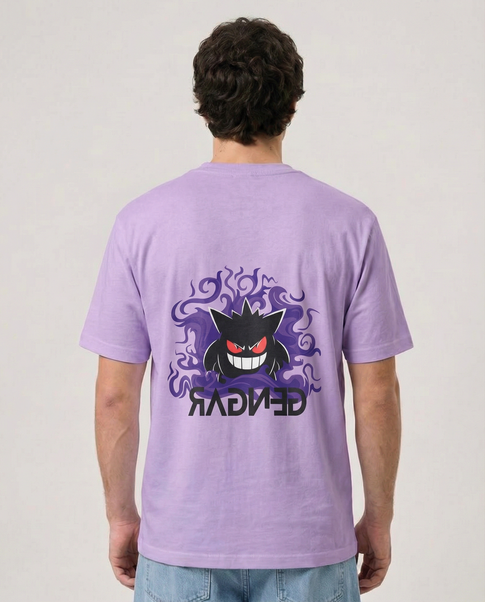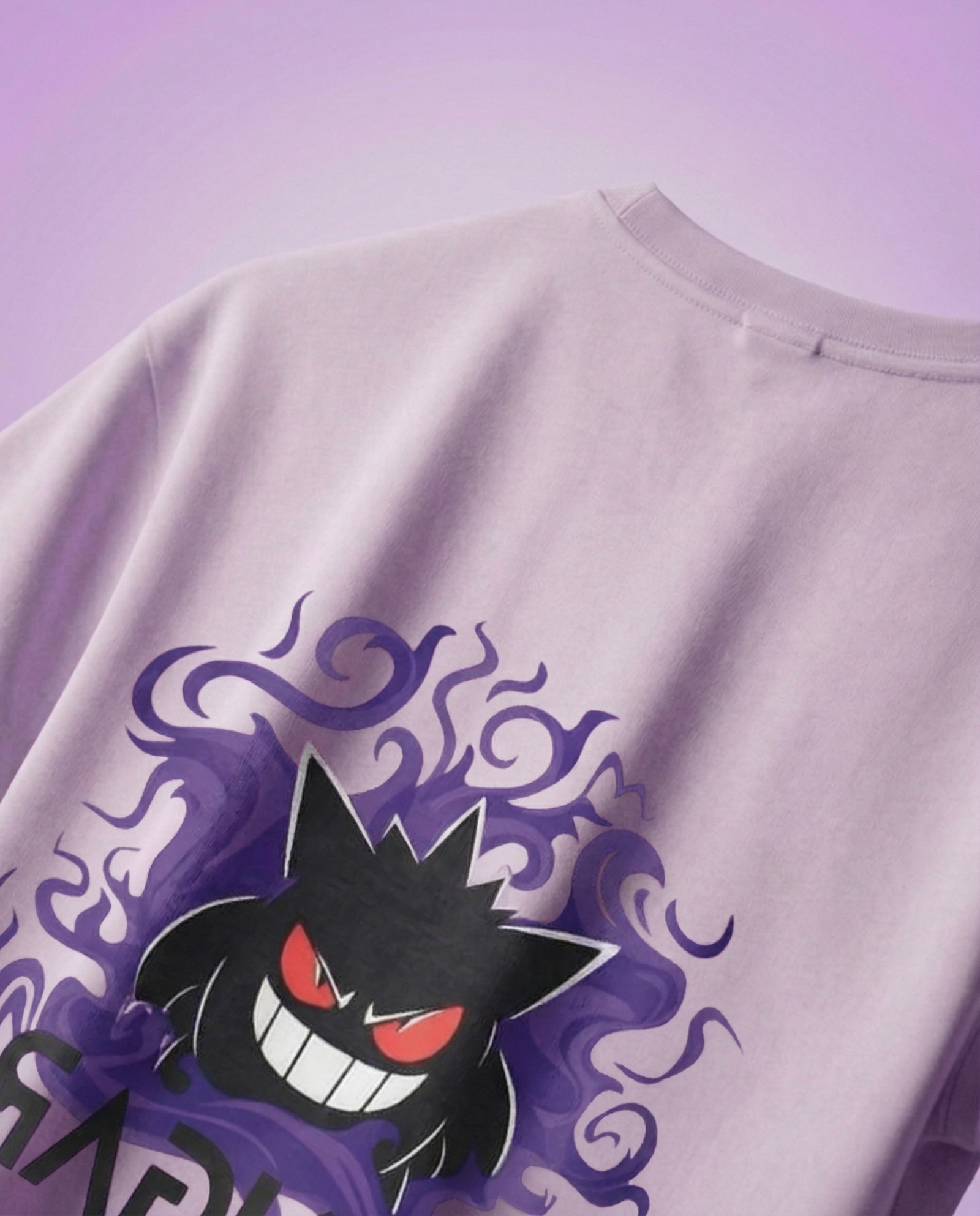 For the trainers who prefer the dark side. This soft lavender tee showcases everyone’s favorite Ghost-type Pokémon, Gengar, emerging from a swirl of purple energy. The “Gengar” text is mirrored for a distorted, glitch-style streetwear look.