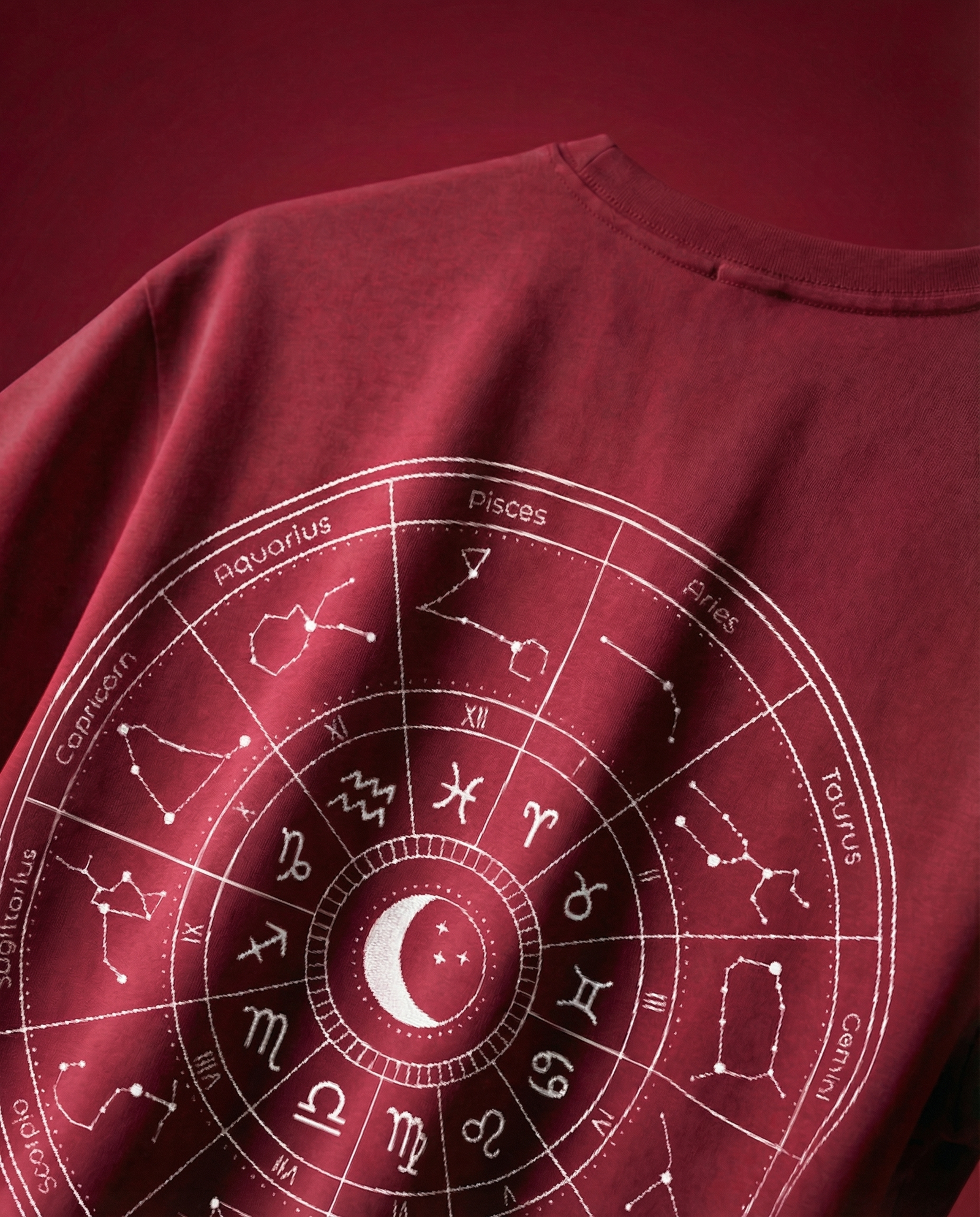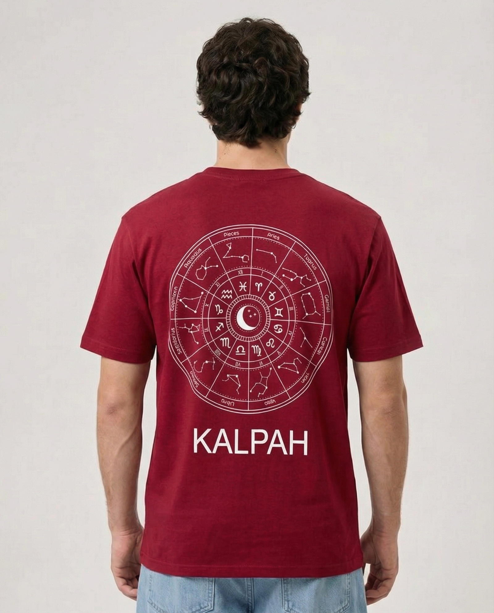 Align your style with the stars. This deep maroon tee features a comprehensive white-line “Kalpah” celestial chart on the back, mapping out the twelve zodiac constellations and their corresponding houses. It’s a perfect blend of ancient mysticism and modern streetwear.